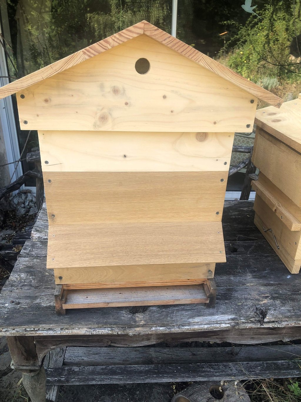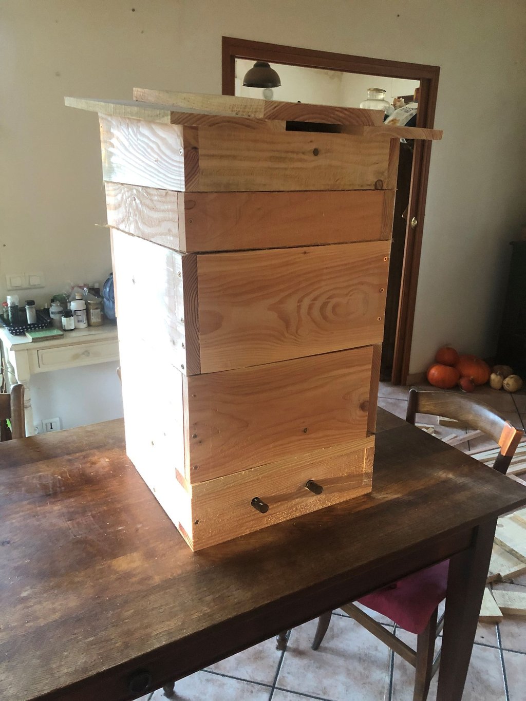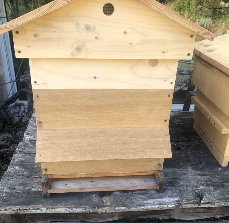 Les ruches Dadant classique de petite production, fabriquées artisanalement en douglas local, livrées avec une hausse et un toit chalet pour préserver un caractère esthétique.
